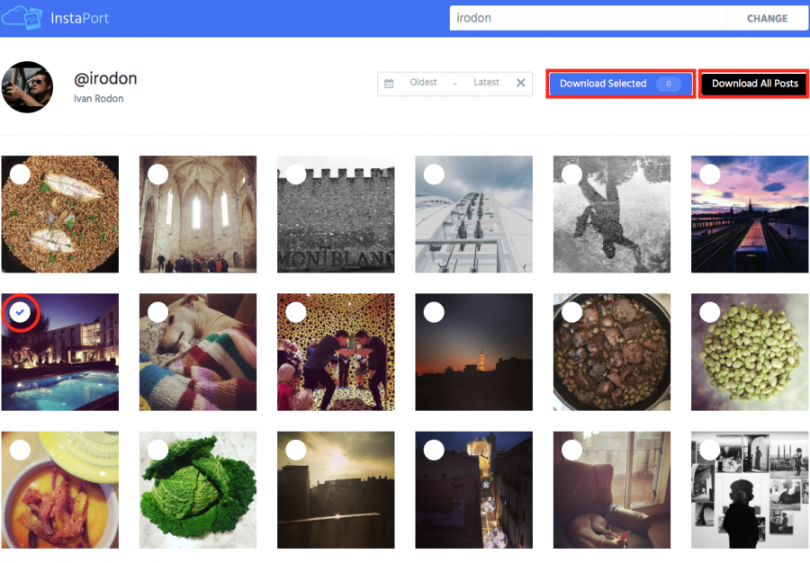 3) Seleccionem les imatges o vídeos que volem descarregar, o premem a Descarregar tots els posts.