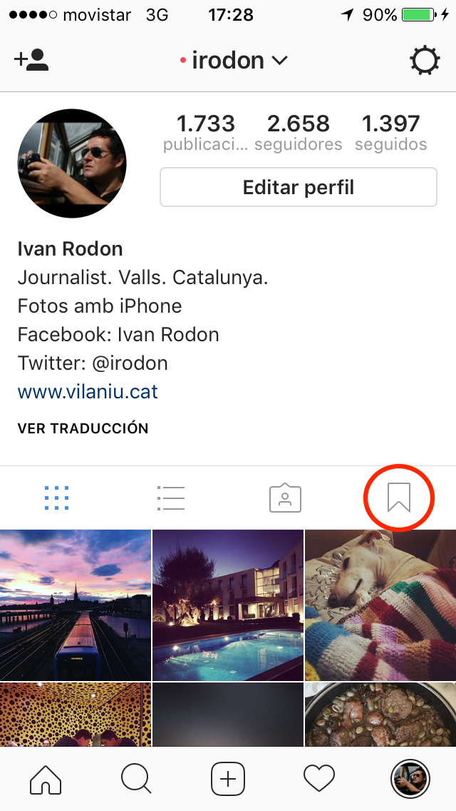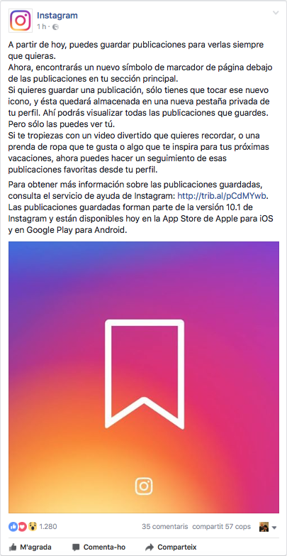 No passa una setmana que Instagram ens dóna a conèixer noves actualitzacions de la seva xarxa social: Campanyes de publicitat (via Facebook), Instagram Stories, vídeos en streaming, i, des d’avui mateix, ja podeu guardar en el vostre perfil totes les fotos i vídeos que desitgeu, siguin vostres o no. Imagineu que prepareu una presentació i us ha agradat una fotografia d’una persona que seguiu a Instagram. O poseu pel cas que heu vist un vídeo amb el què us heu fet un fart de riure, i voleu conservar-lo per compartir-lo més tard amb els amics. Doncs des d’ara mateix, ja podeu fer-ho. Només cal que actualitzeu l’última versió d’Instagram, aneu al vostre perfil, i cliqueu la icona de la marca de llibre sobre les fotografies o vídeos que vulgueu conservar.