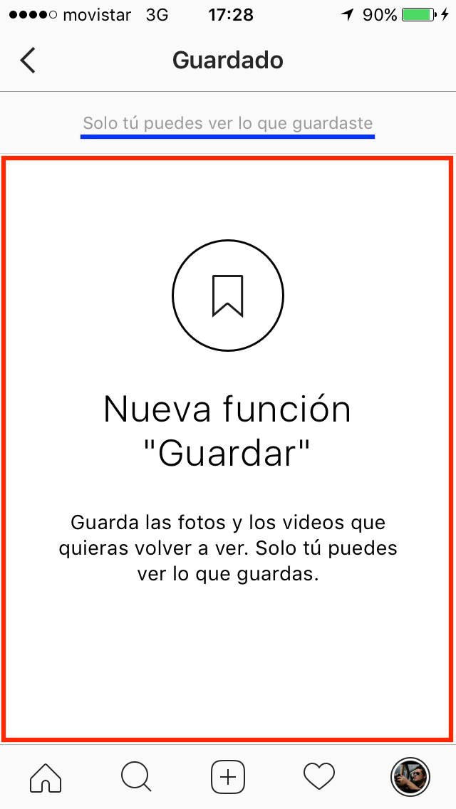 No pasa una semana que Instagram nos da a conocer nuevas actualizaciones de su red social: Campañas de publicidad (vía Facebook), Instagram Stories, videos en streaming, y, desde hoy mismo, ya puedes guardar en tu perfil todas las fotos y vídeos que quieras, sean tuyas o no. Imagina que preparas una presentación y te ha gustado una fotografía de una persona a la que sigues en Instagram. O has visto un vídeo con el que te has hartado de reír, y deseas conservarlo para compartirlo más tarde con los amigos. Pues desde ahora mismo, ya puedes hacerlo. Sólo es necesario que actualices la última versión de Instagram, vayas a tu perfil, y pulses el icono de la marca de libro sobre las fotografías o vídeos que quieras guardar.