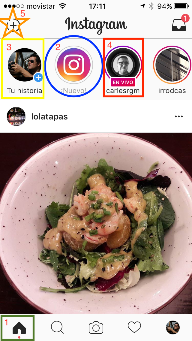 En segon lloc, a l’inici de l’app, a la icona de la caseta, premeu el botó (+) que indica “la teva història”, amb la vostra fotografia de perfil. És la mateixa opció que si voleu anar a les Instagram Stories. Des d’aquí podreu iniciar l’emissió. També podeu fer-ho fent clic directament sobre la icona (+) que apareix al marge superior esquerra.